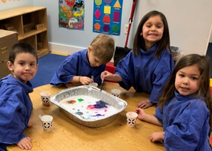 We focus on social adjustment to group situations and development of independence. We include creative art experiences, activities to help fine motor development, stories and language activities, singing and rhythm instruments, play for large motor development and development of basic cognitive skills. For the four-year-old class, we also help prepare for kindergarten, develop skills and provide concrete learning activities appropriate to each child's level of ability.